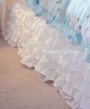Our much loved Cottage Colors Petticoat Ruffles quilt set is just beautiful with rows of ruffles with little pink roses, aqua mint, pretty peach, flowers on beach house blue, periwinkle and more! A gorgeous mix of cottage colors on pure white! Tiers of ruffles on the pillow cases too!